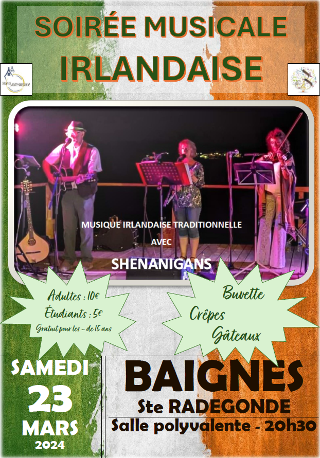 Le trio d’instrumentistes « Shenanigans » (espiègleries, manigances en français) vous emmèneront en Irlande au cours de cette soirée festive organisée par la chorale de Baignes « Ensemble Béania ».